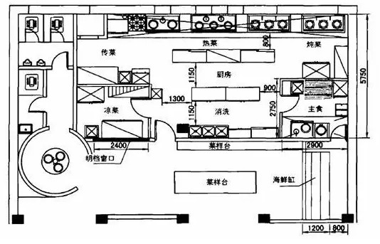不能设计为独立的工作间时,也要有相对独立的功能区域。可以采用无形的隔断,例如用冰柜、碗柜、水池排列形成墙,利用设备围拢形成工作区间。结合实际情况灵活应用,可以,增加自然的采光亮度和通风效果,使工作间宽敞明亮。即使日皮视频APP苹果下载处在没有自然采光的位置,减少隔断,或用透明度好的玻璃隔断,也有利于照明和视距,节省照明用电便于通行、协调和管理。图5-6是一个小餐馆的日皮视频APP苹果下载的设计图纸,由于使用的设备比较多,采用了部分无墙隔断设计。为保持卫生洁净,在主食加工间、凉菜间设计了隔断,凉菜间设计了凉菜出餐口,便于出餐,也保证了清洁卫生。凉菜间隔断可阻挡油烟废气、清洁美观,也隔断了客人从凉菜出餐口向内观望的视线。消洗、传菜间采用了无墙隔断,使功能区域分割清楚,又便于配合工作。