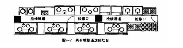 设备维修保养是必不可少的。有条件的日皮视频APP苹果下载应尽量留出设备维修空间或机动的空间。如炉具的用量大、处在高温潮湿的环境中,容易发生故障,作为主力设备,如发生故障.必须尽快维修。灶台一般不宜搬动,可设维修通道安装、检修、维修、保持卫生清洁。图5-7是一个大饭店的热菜间的灶台一部分,在两排灶台之间设计了0.7m净宽的检修通道。