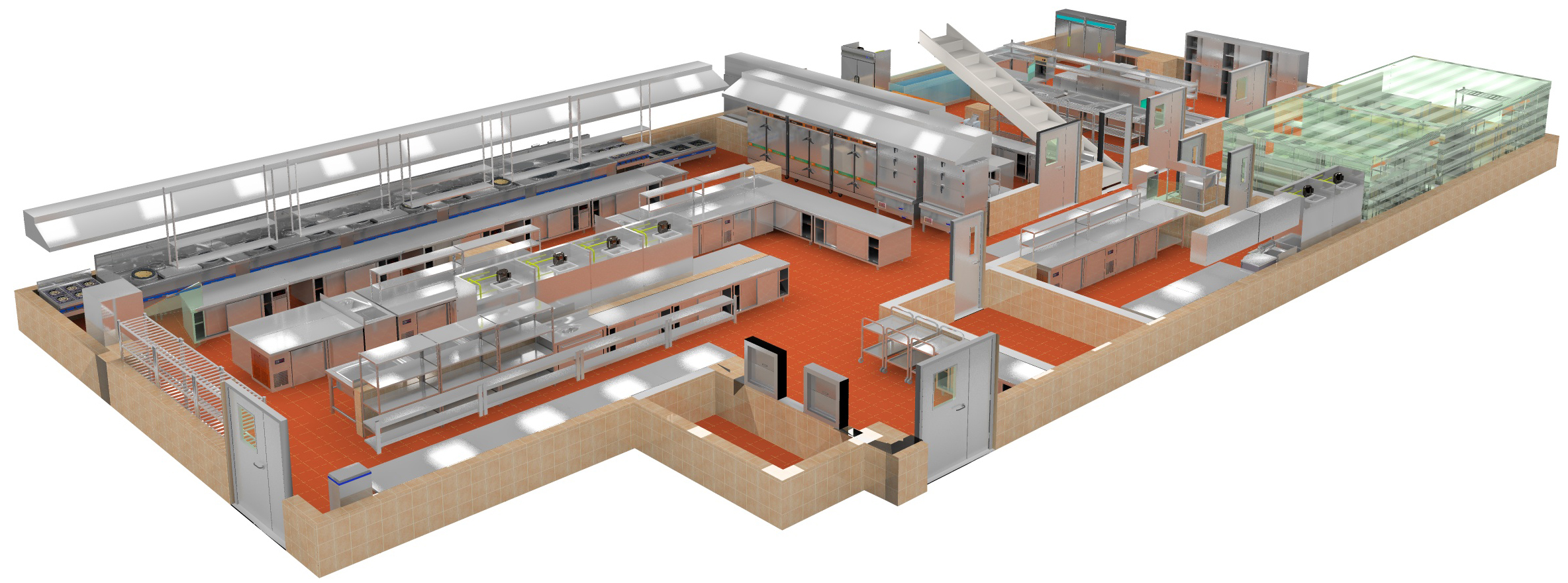 如果一字形布局布置不下所有所需设备,可以将部分设备改变方向,设置在主灶区侧面,形成L形布局。侧面设置的多为辅助设备,如汤灶,炖菜灶,需要刀工切配量比较少,可以只设打荷台或借用打荷台,不设专用的刀工切配工作台。此种设计方式应用得也比较多。