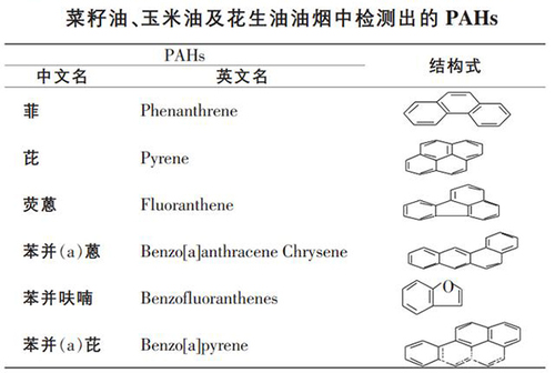 再来看PAHs,PAHs即多环芳烃。在此前的报道中,就曾指出食用油在高温过程中会产生具有生殖毒性、致癌性及致突变型的多环芳烃有机物,但由于不确定物质的具体成分,不少人也是半信半疑。但随着苯并芘、二苯并蒽等物质在菜籽油中的检出,人们陆续开始认识到油烟中PAHs的真面目。根据对菜籽油、花生油以及玉米油的检测,油烟中的PAHs主要包括菲、芘、荧蒽、苯并蒽、苯并呋喃以及苯并芘等,其中花生油油烟中的PAHs含量最高,达到了22.8ug/m3,其次是玉米油,含量为5.50ug/m3,菜籽油仅为1.08ug/m3。而玉米油油烟中除了上述物质,还包含了苯并呋喃。