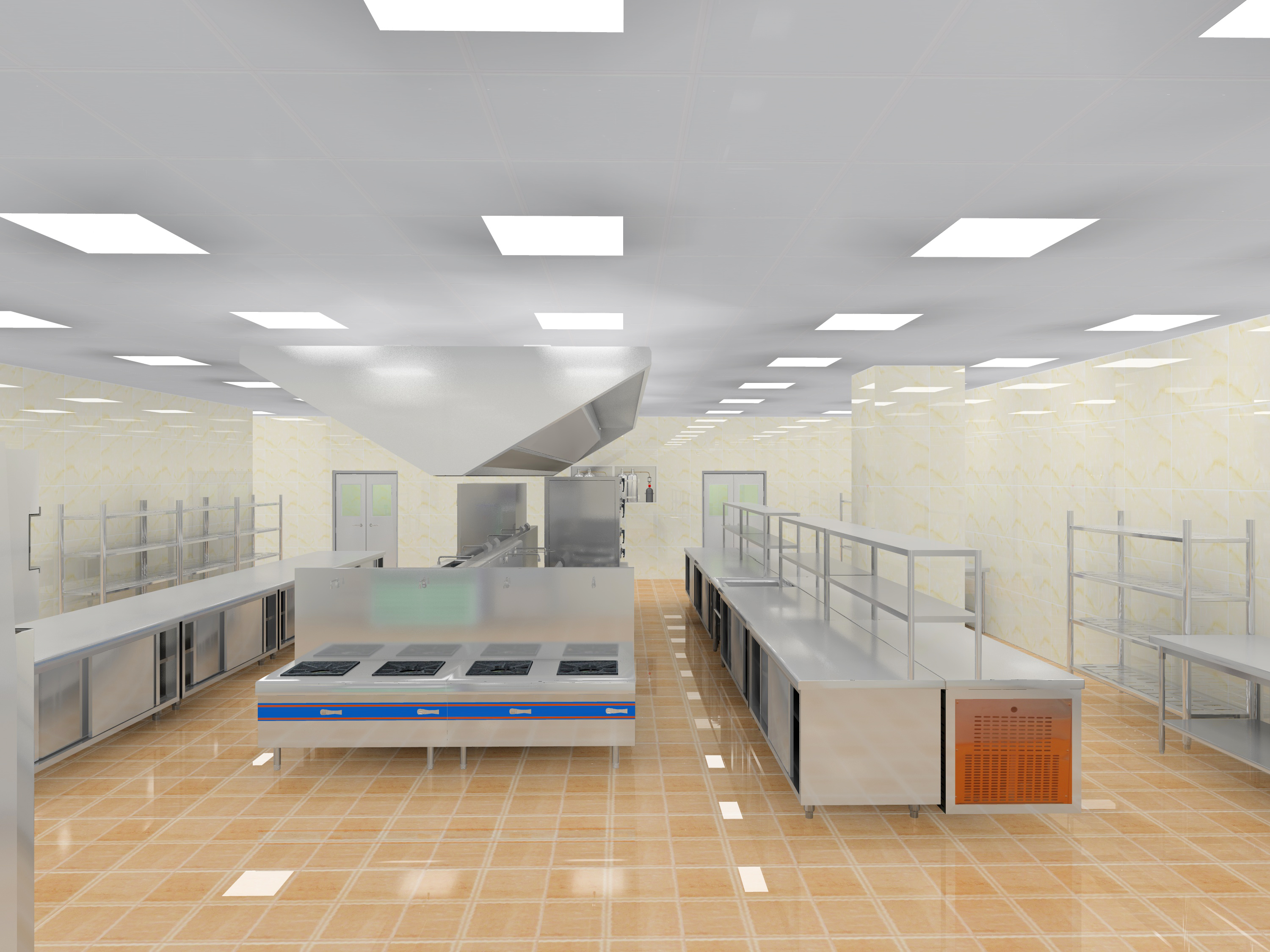 库房应选用在方便进货及领用食材,保持道路畅通,在库房运输的走廊上宽度不低于1.5m。