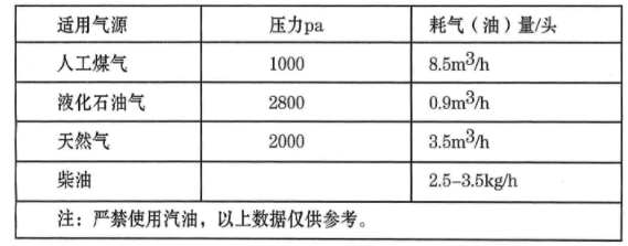 4、耗气(油)量及燃气压力