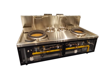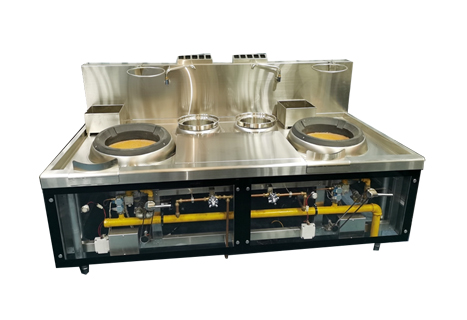 6、双连体比例阀,带稳压阀,风气联动,全铜管气制链接。加重加深尾撑,铜管上水,十字水阀,带笊篱架凉水盒,调味版,全钢把手。
