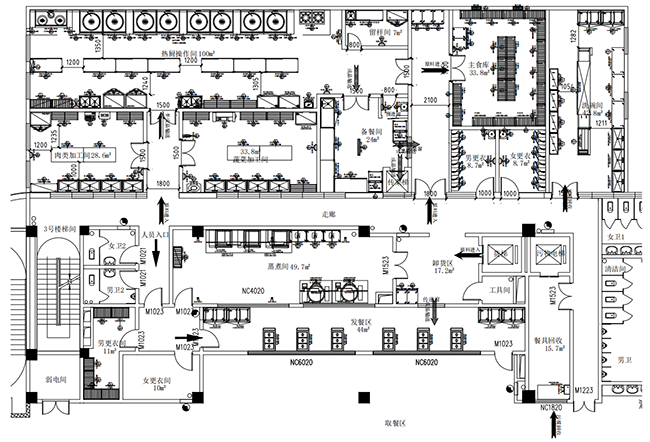根据主通道位置与走向,以及各种工作流程走向,初步确定区域隔断、进出门位置。各种工作流程有各自的路线,根据各行其道、不交叉、不回流、不穿越无关区域的原则,确定进料、出餐、收残、餐具、垃圾的流程分通道。为保证工作流程快捷高效,要缩短传送距离,截弯取直。较小的日皮视频APP苹果下载若不能设分通道的日皮视频APP苹果下载,也要利用运行路线、运行时间差,把不应交叉的流程区分开,要达到各行其道、不交叉、不回流、不穿越无关区域的要求。